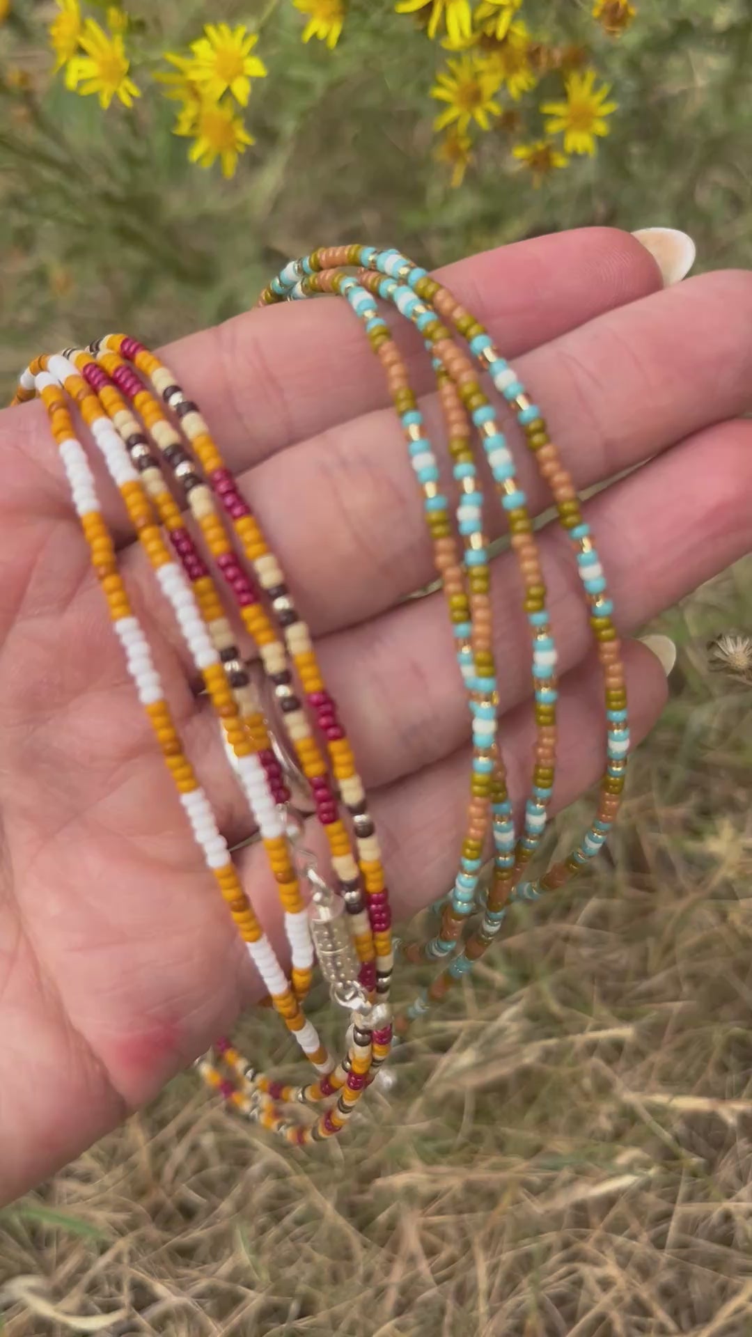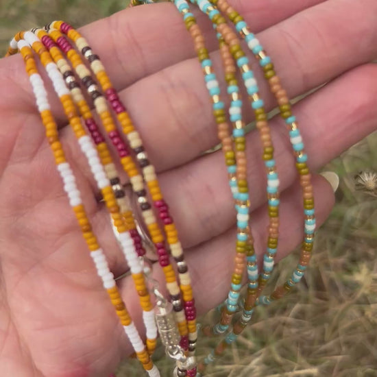A hand beaded necklace in the Forget-me-not palette.